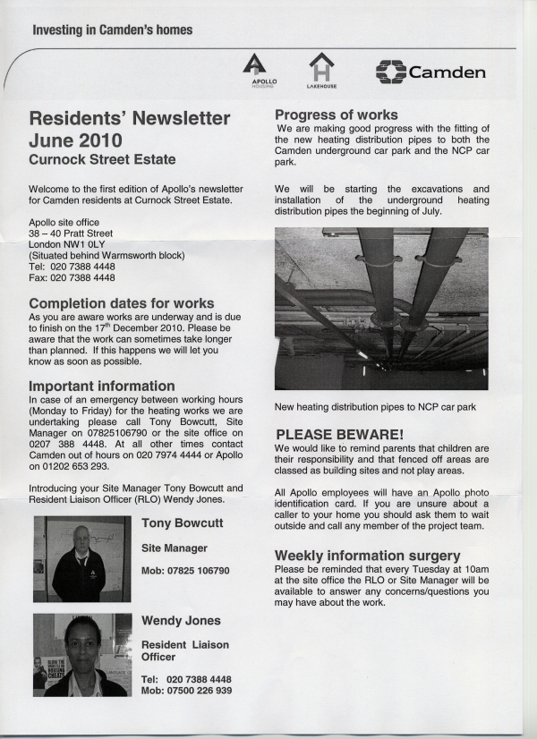 Based on the meeting about the Heating Works with the Camden Council and the contractors on the 07th April 2010 at The Marr, we requested from Mr Harry Odoi (Capital Works Service Charge Officer) the following: