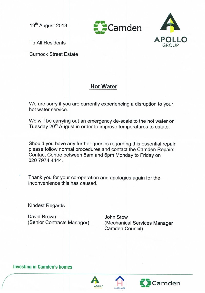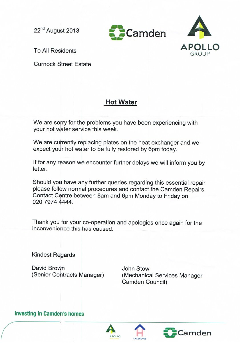 The following letter was sent to the residents of the Curnock Estate on the 20th August 2013. The same date that the works were carried out.