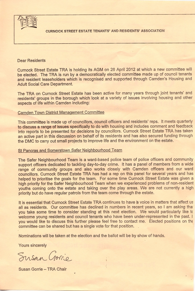 Curnock Street Estate TRA is holding its AGM on 26 April 2012 at which a new committee will be elected. The TRA is run by a democratically elected committee made up of council tenants and resident leaseholders which is recognised and supported through Camden's Housing and Adult Social Care Department.