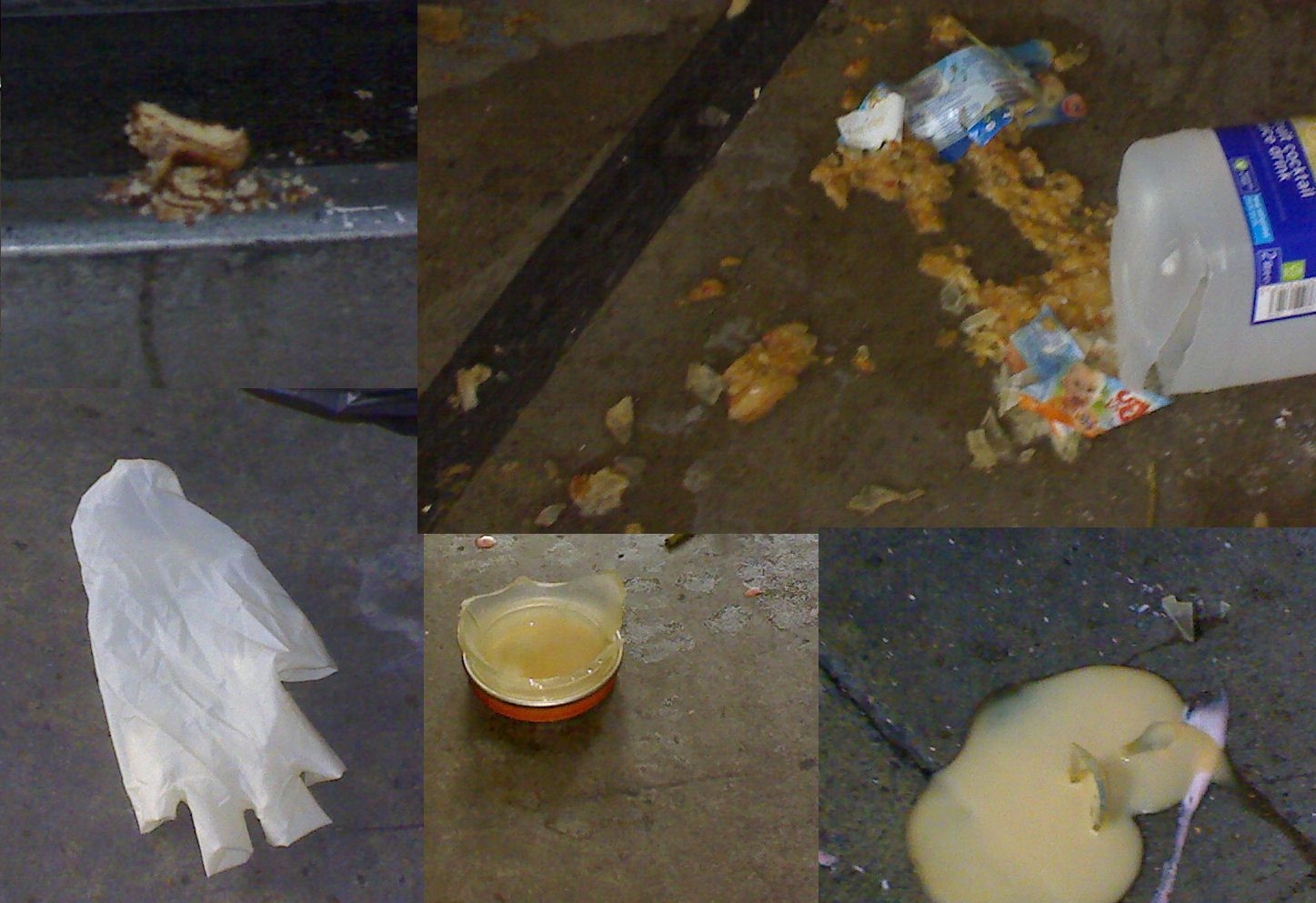 This picture was taken on 13:42 this afternoon outside the refuse room in Goldthorpe House. More pictures of the dangerous rubbish (health and safety) can be found here.