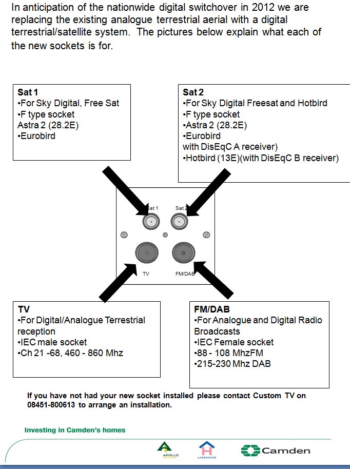 The contractor will test the sockets by looking at the residents television reception, as well as the test carried out at time of commissioning the system.