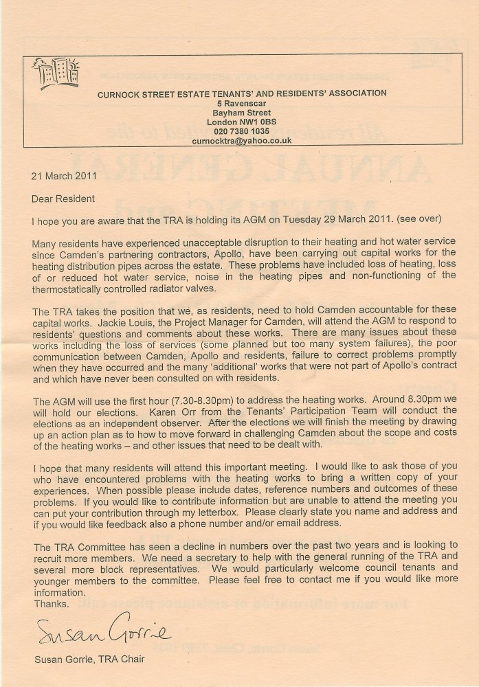 The AGM will use the first hour (7. 30-8. 30pm) to address the heating works. Around 8.30pm we will hold our elections. Karen Orr from the Tenants' Participation Team will conduct the elections as an independent observer. After the elections we will finish the meeting by drawing up an action plan as to how to move forward in challenging Camden about the scope and costs of the heating works - and other issues that need to be dealt with.